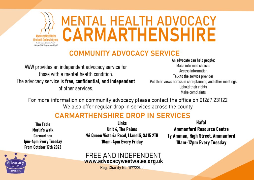 AWW https://advocacywestwales.org.uk/ provides an independent advocacy service for people of all ages with a mental health condition, including veterans and carers. The service is free, confidential and independent of all other services.